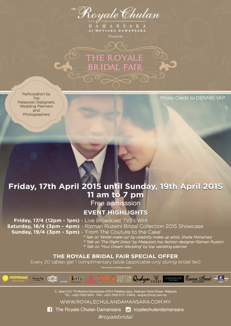 Many thanks for having us to be participating for the Royale Chulan Damansara Bridal Fair, we are the only photographer that will be participating in this grand event. Thanks to Royale Chulan for using one of our pre-wedding picture for the banner ad. One of the couple's friend spotted and forwarded the picture to them, they felt wonderful to be included. This was taken like 2 years back, good time to recall some beautiful memories with their new born baby. For those that had dropped by to see us, I am sure you all got some fantastic deals that we have not announced before, we managed to close about 4 assignments, for a small business like us, it is consider very good, hehe. Its nice to mingle around sometimes. :)